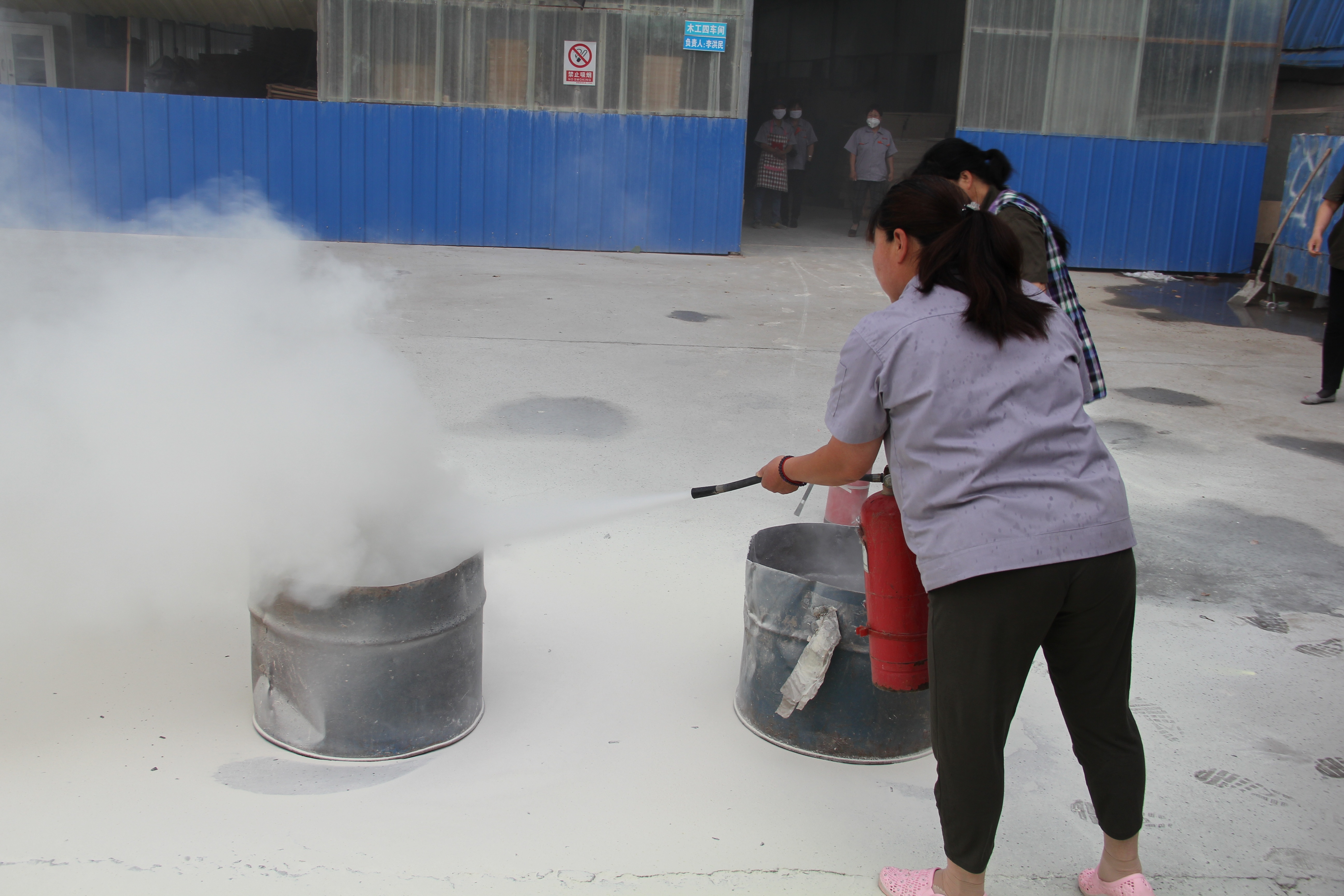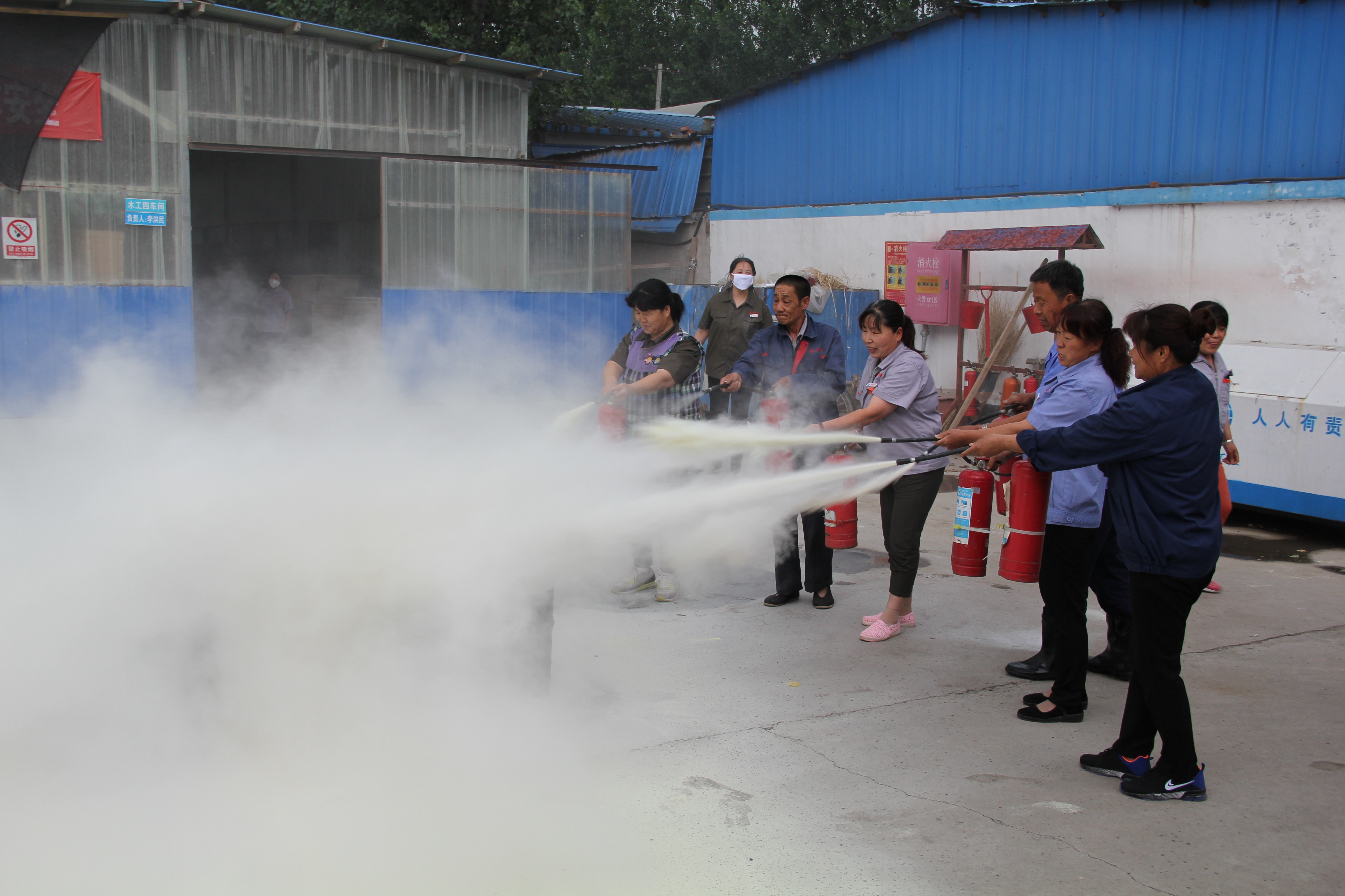 最后我們?nèi)w員工一起學(xué)習(xí)了逃生及滅火器滅火的基本常識(shí)與方法,并讓員工們實(shí)際操作練習(xí)滅火。